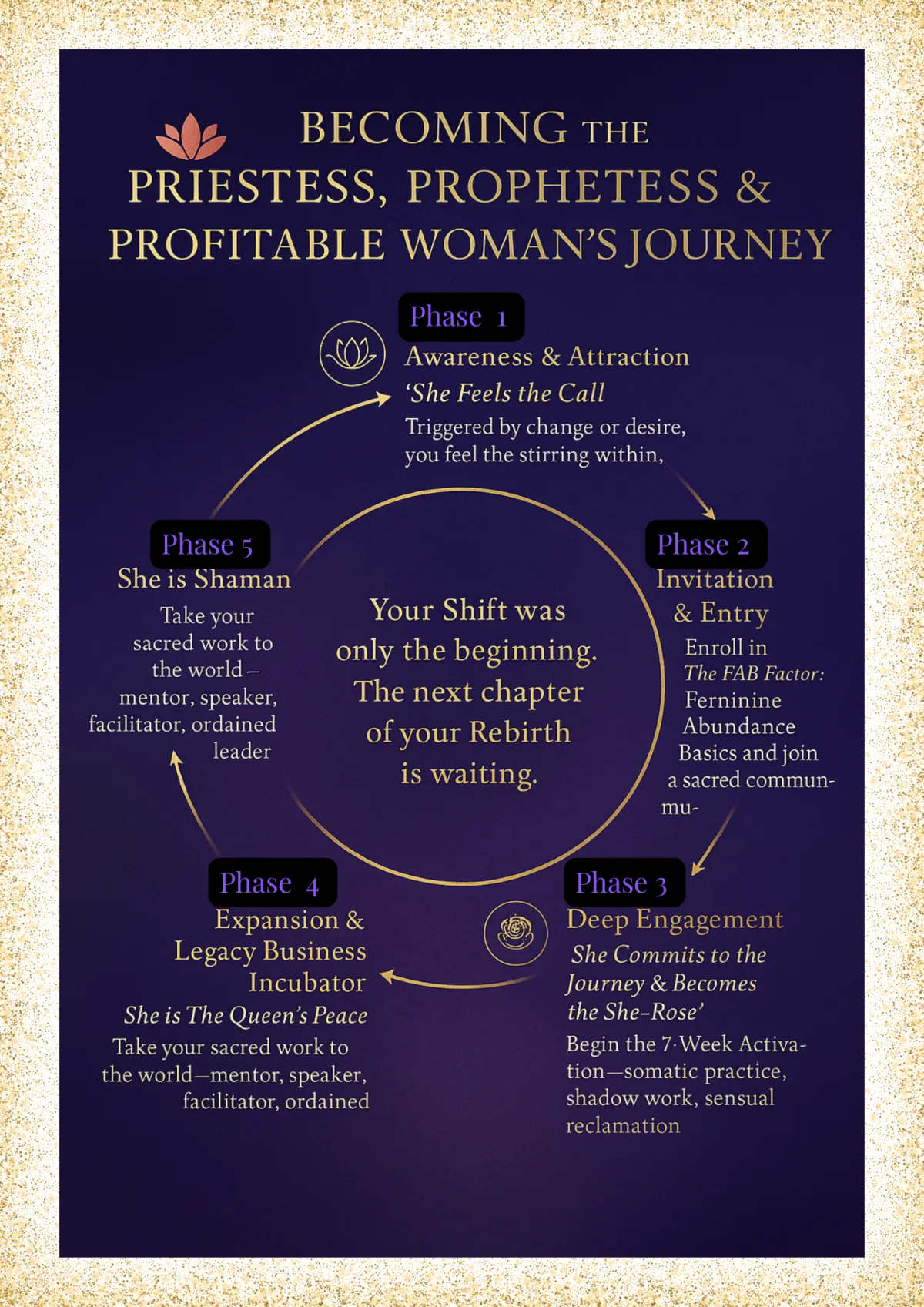 The JUICY framework is not a curriculum. It is a rite. Each letter marks a threshold that must be crossed in the body, not just understood in the mind. There is no bypassing here. There is only willingness — and what becomes possible when she says yes. Yes to herself. Yes to her voice. Yes to her vision, reimagined and redefined by sacred process and rites that activate the soul and contribution.